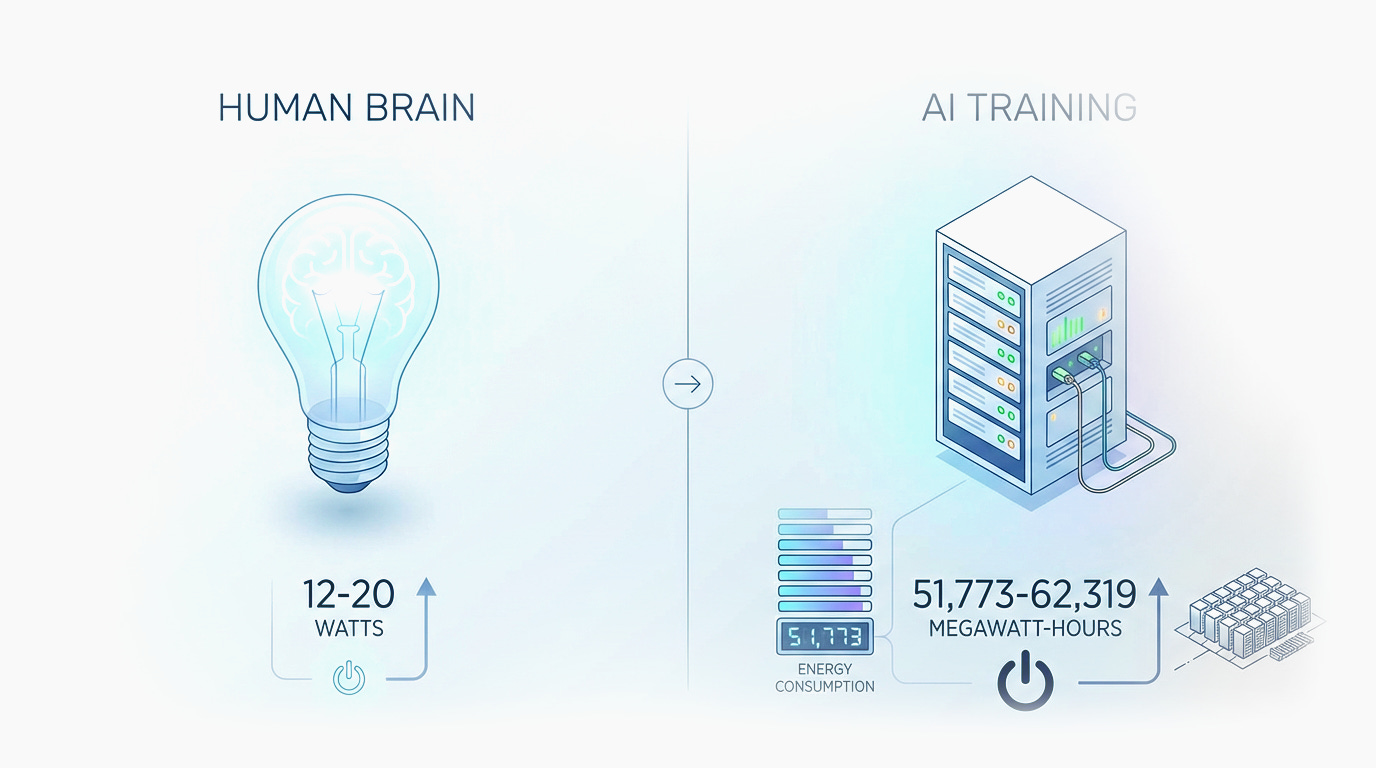 Energy efficiency: Brains use 12-20 watts vs. 50,000+ watts for AI training (GPT-4).
